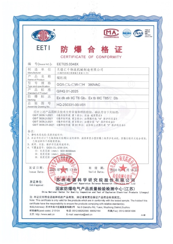 Vor kurzem hat das Kernprodukt von Wuxi Huiqian Logistics Machinery Manufacturing Co., Ltd. – der Rollenförderer – strenge Tests erfolgreich bestanden und offiziell das EETI-Zertifikat für Explosionsschutz erhalten! Diese Zertifizierung bedeutet, dass die explosionssichere Leistung des Rollenförderers von Huiqian international anerkannten Sicherheitsstandards entspricht, eine zuverlässigere Materialtransportlösung für Hochrisikoindustrien wie Petrochemie, Kohlebergbau, Pharmazeutik und Militärindustrie bietet und die starken technischen Fähigkeiten des Unternehmens im Bereich explosionsgeschützter Logistikausrüstung demonstriert.